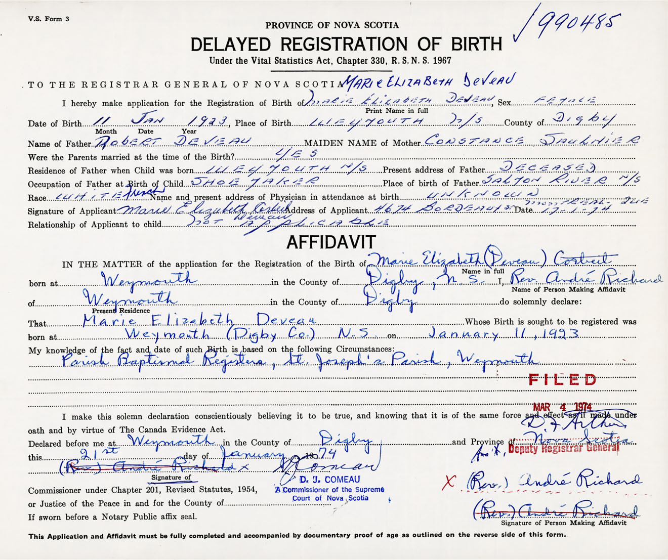 I hereby make application for the Registration of Birth of Marie ElizabethDeveau Sex Female