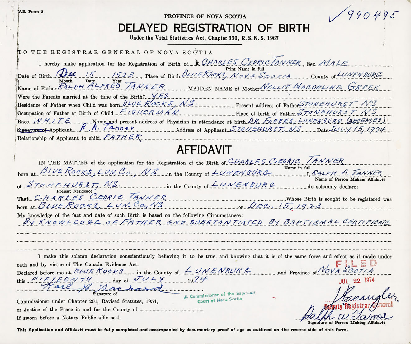 Signature of Applicant R. A. Tanner Address of Applicant Stonehurst, Lunenburg Co., NS Date 15 July 1974