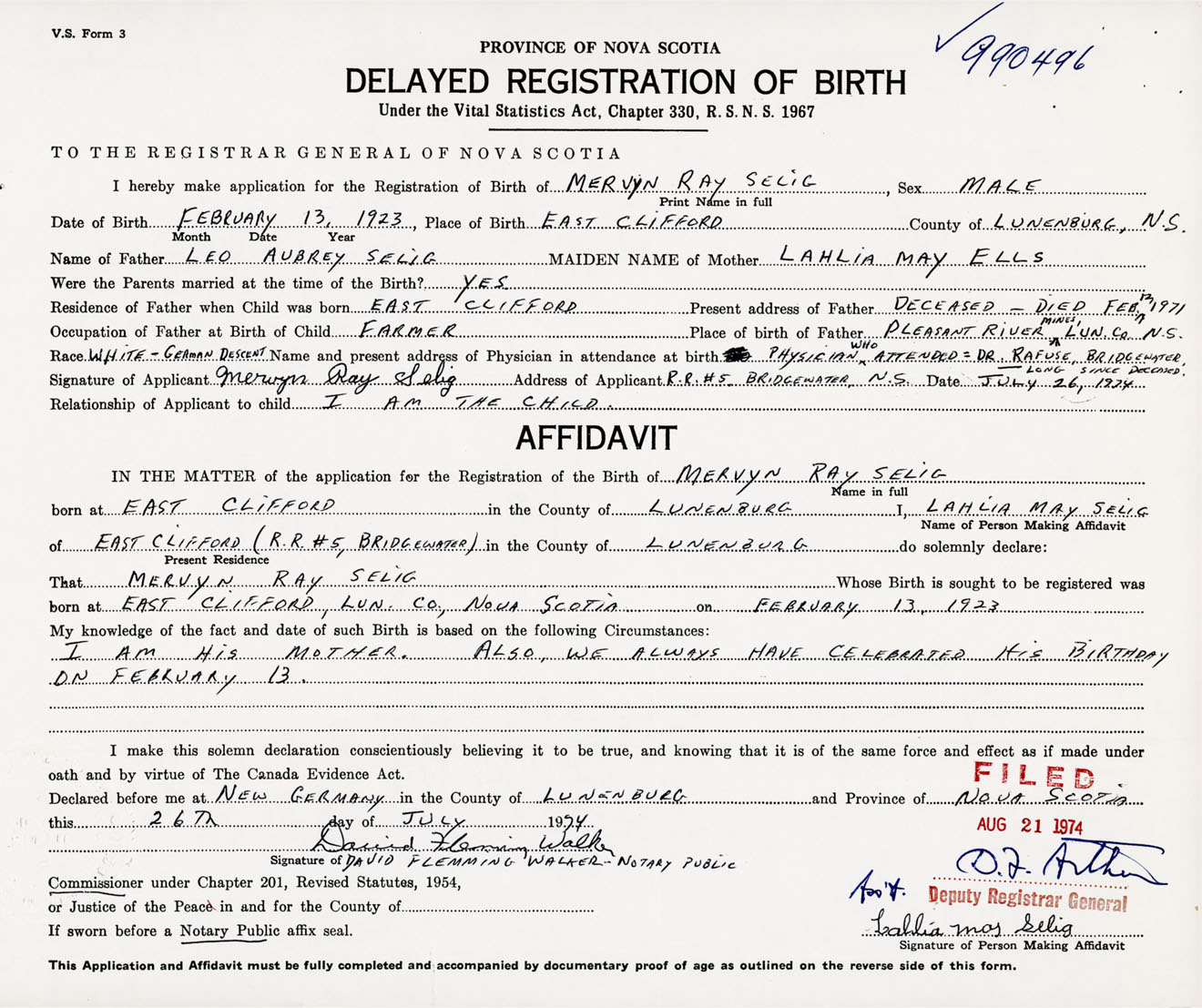 Signature of Applicant Mervyn Ray Selig Address of Applicant RR #5, Bridgewater, Lunenburg Co., NS Date 26 July 1974