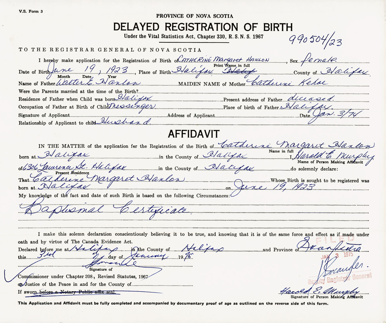I hereby make application for the Registration of Birth of Catherine MargaretHanlon Sex Female