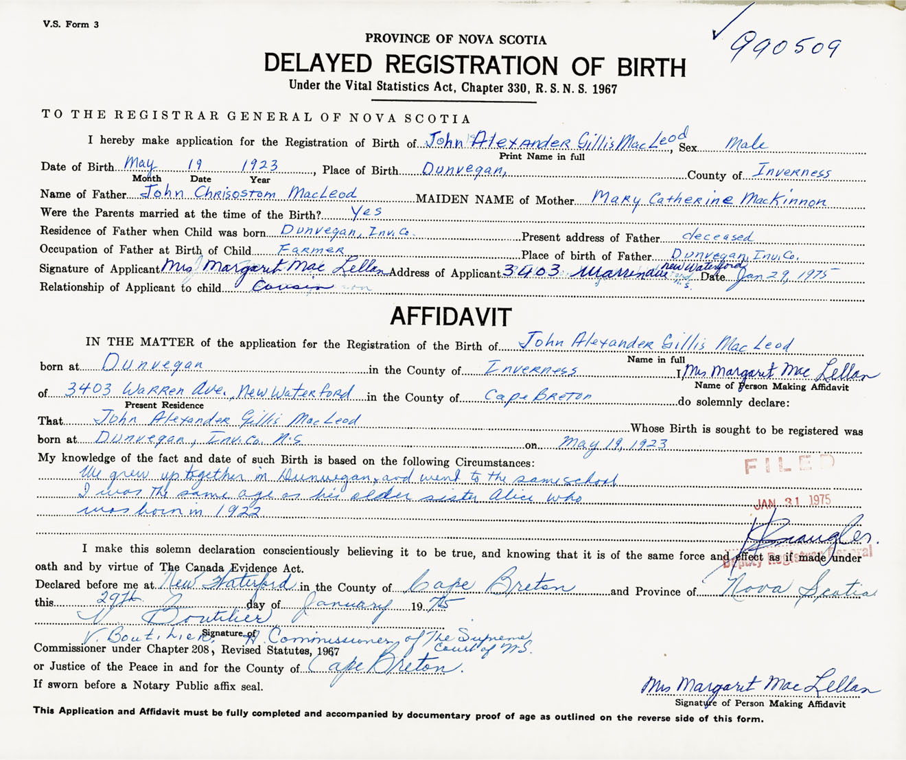 born at Dunvegan Inverness County on May 19, 1923
