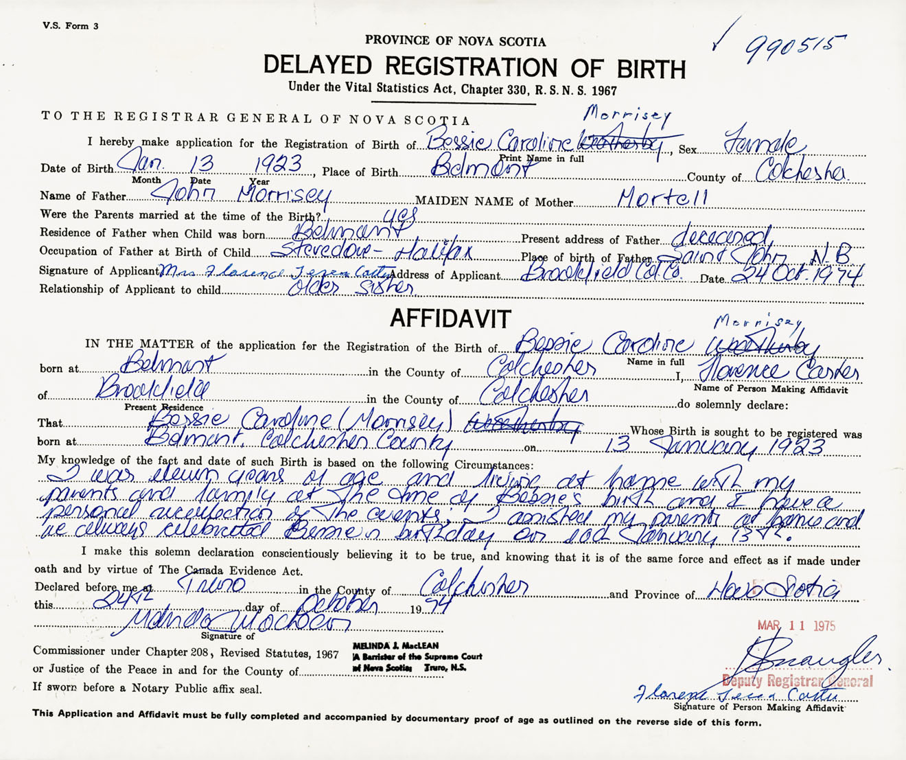 IN THE MATTER of the application for the Registration of the Birth of Bessie CarolineMorrisey