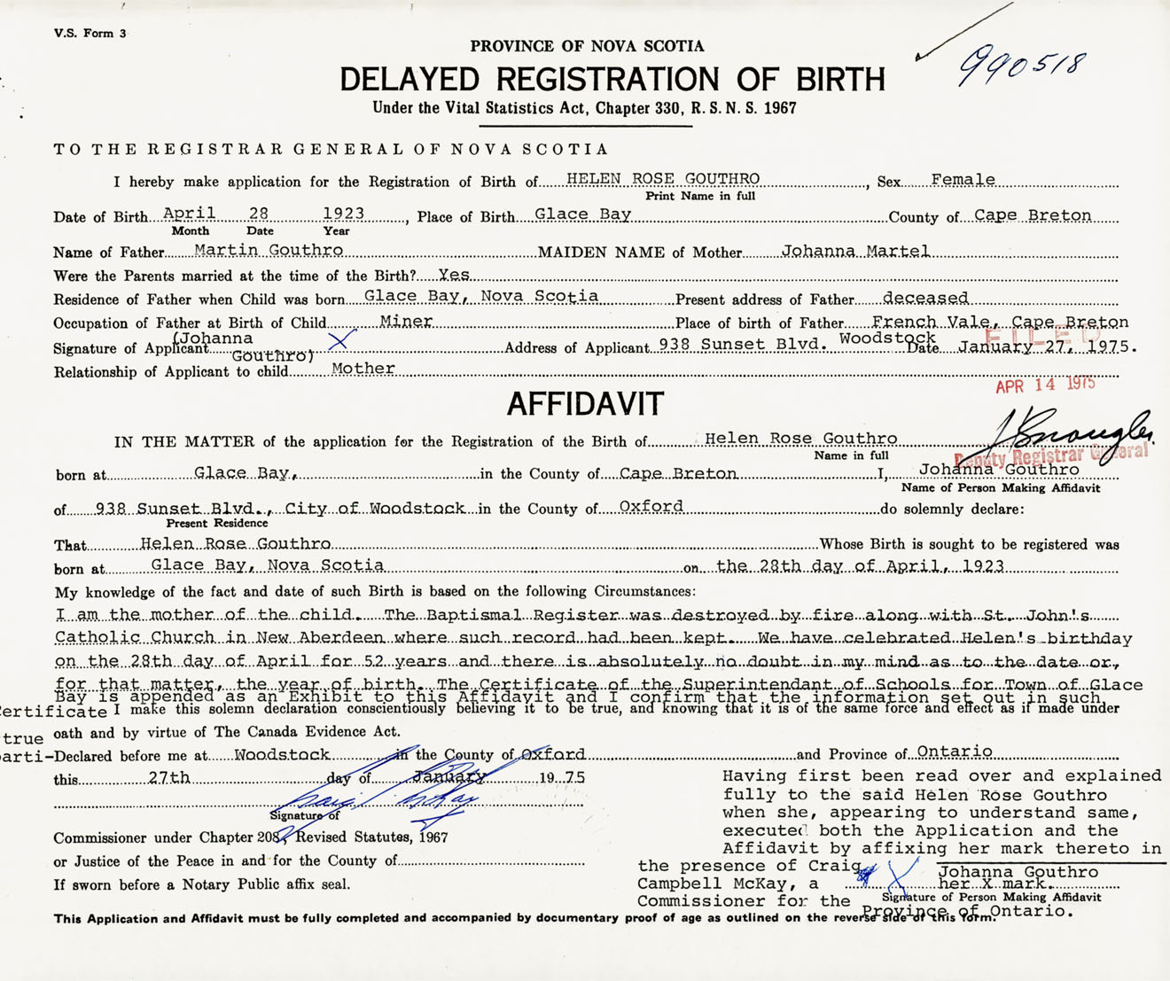 I am the mother of the child. The Baptismal register was destroyed by fire along with St. John's Catholic Church in New Aberdeen where such record had been kept. We have celebrated Helen's birthday on the 28th day of April for 52 years and there is absolutely no doubt in my mind as to the date or for that matter, the year of birth. The certificate of the Superintendent of Schools for Town of Glace Bay is appended as an exhibit to this affidavit and I confirm that the information set out in such certificate is true