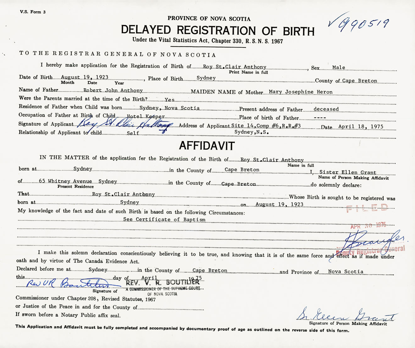 I hereby make application for the Registration of Birth of Roy St. ClairAnthony Sex Male