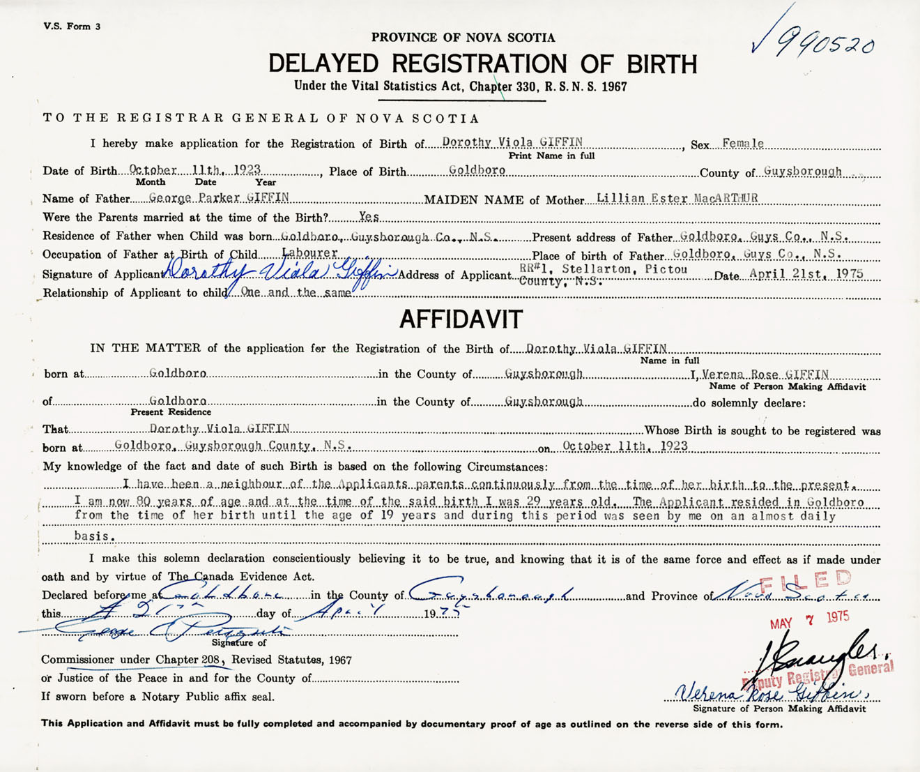 Signature of Applicant Dorothy Viola Giffin Address of Applicant RR#1, Stellarton, Pictou Co., NS Date 21 April 1975