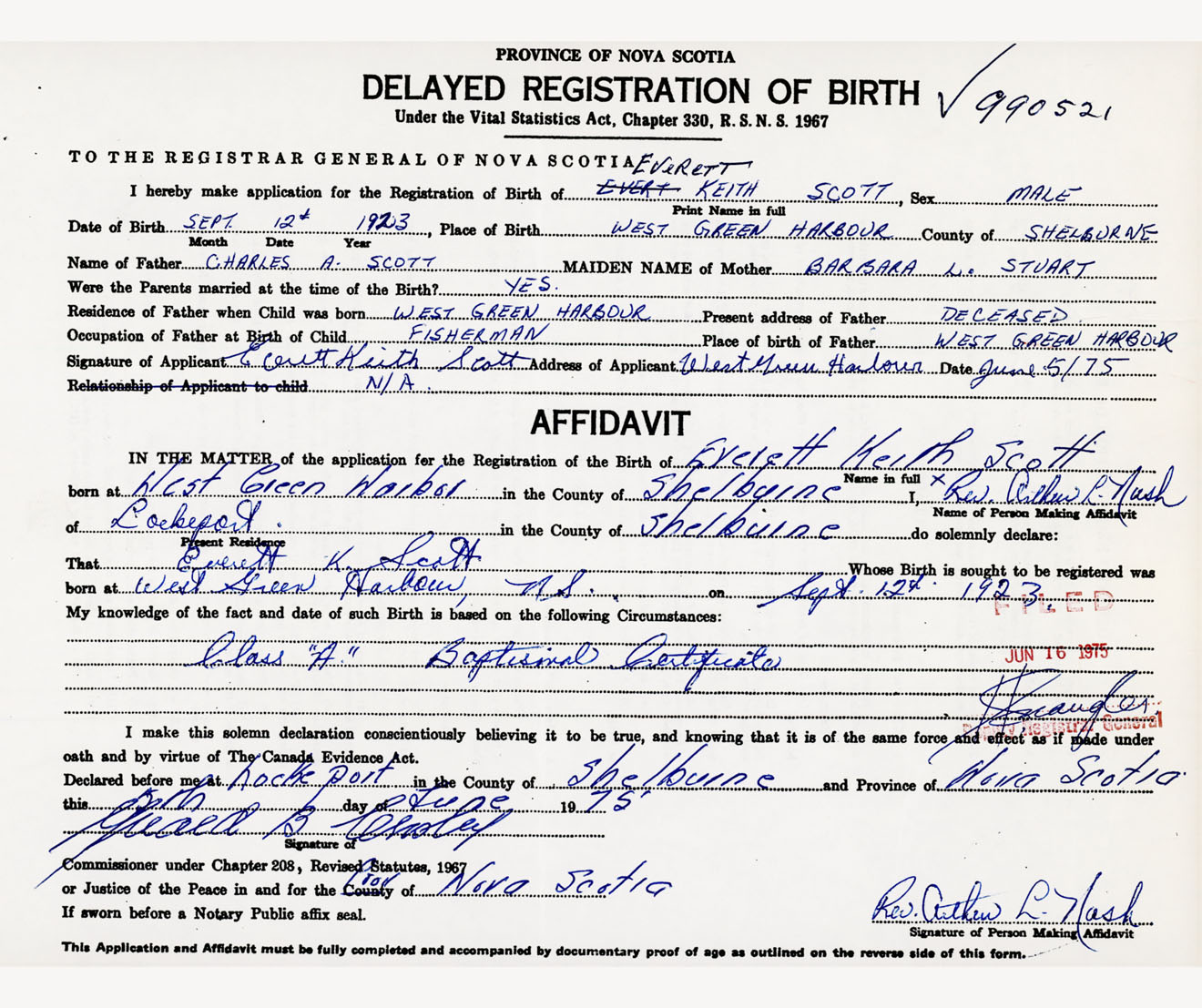 Signature of Applicant Everett Keith Scott Address of Applicant West Green Harbour, Shelburne Co., NS Date June 5, 1975