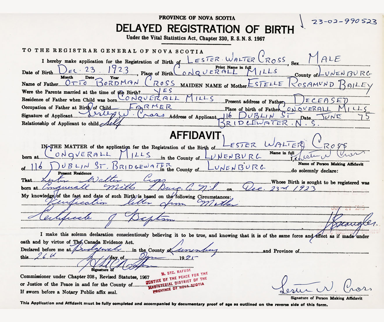 I hereby make application for the Registration of Birth of Lester WalterCross Sex Male