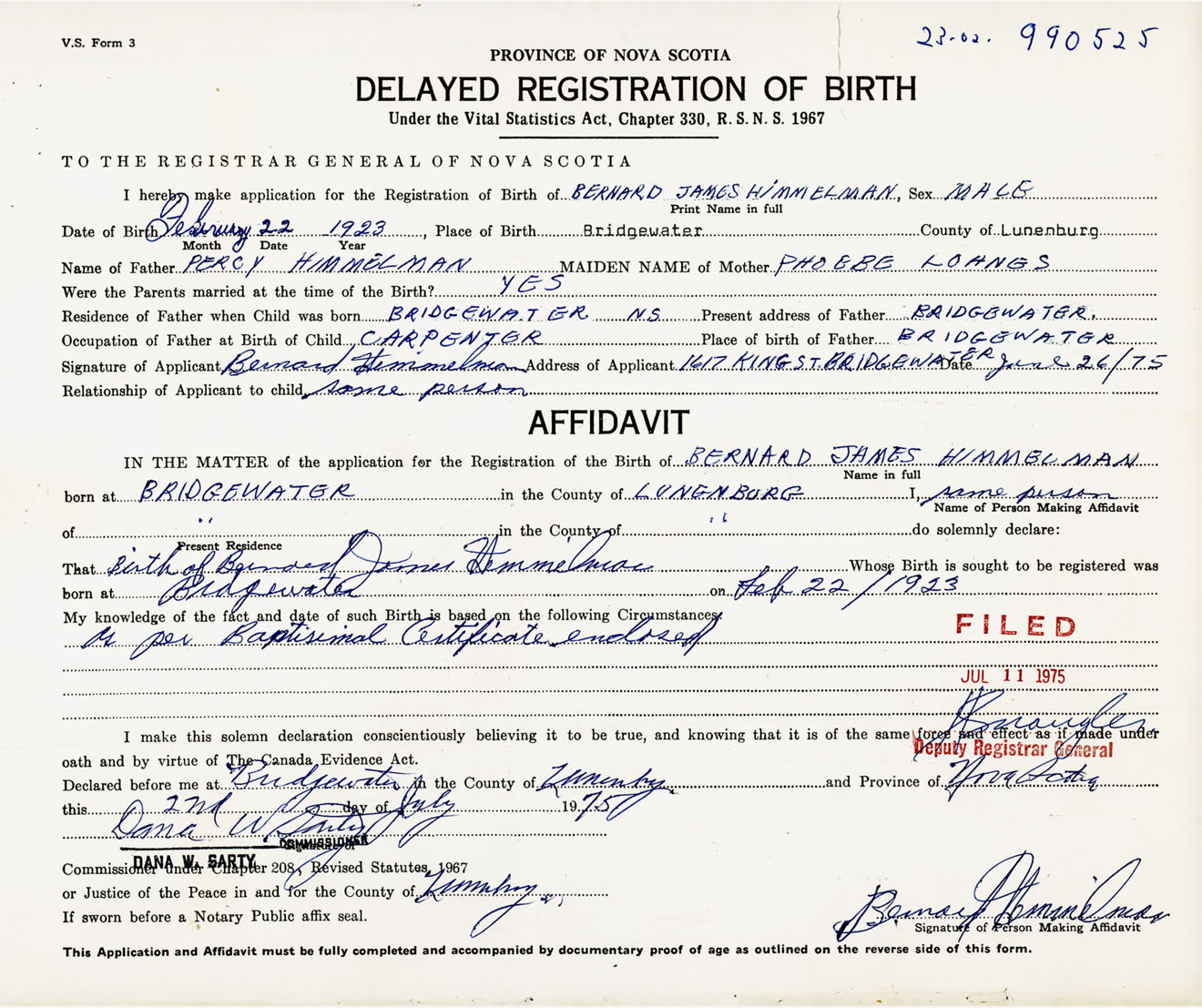 Signature of Applicant Bernard Himmelman Address of Applicant 1617 King St. Bridgewater Date June 26, 1975