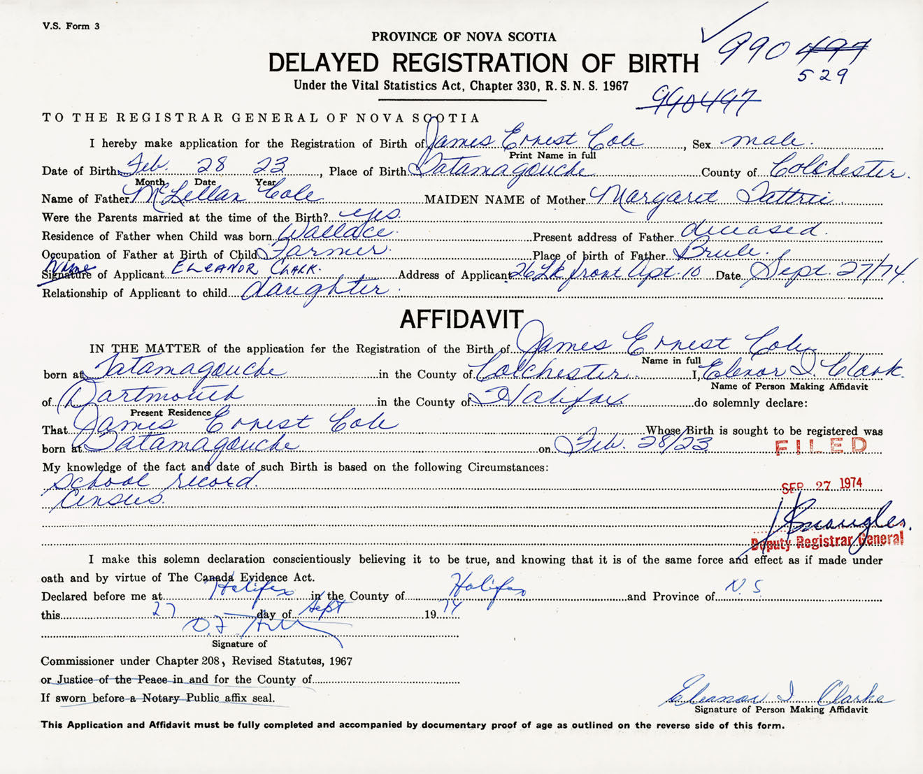 I hereby make application for the Registration of Birth of James ErnestCole Sex Male