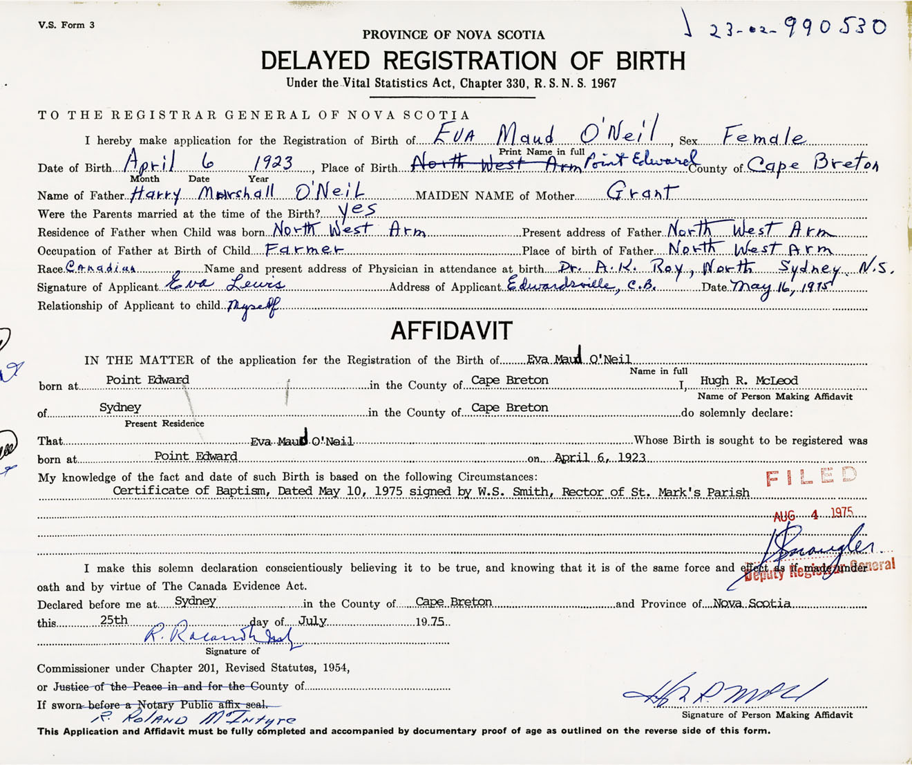 IN THE MATTER of the application for the Registration of the Birth of Eva MaudO'Neil