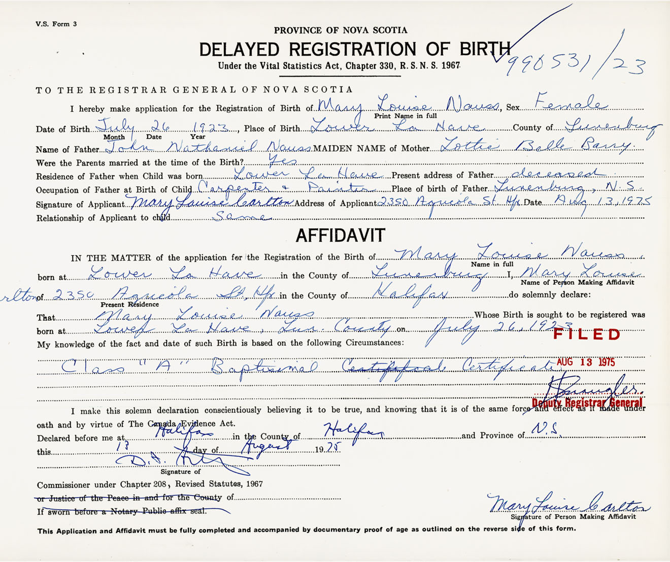 Date of Birth July 26, 1923 Place of Birth Lower LaHaveCounty of Lunenburg