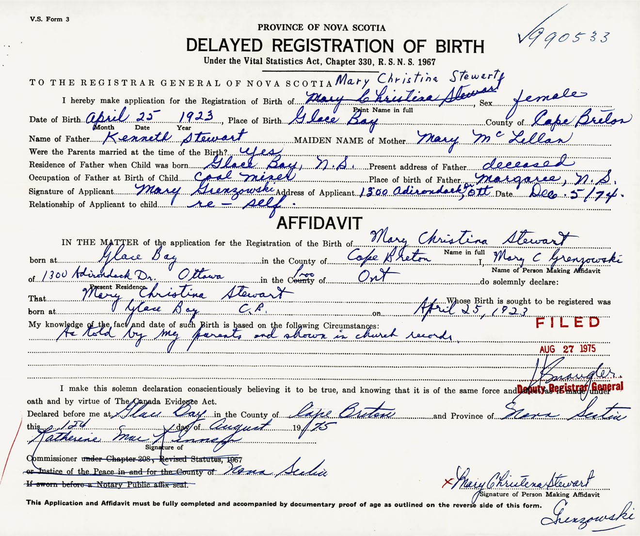 I hereby make application for the Registration of Birth of Mary ChristineStewart Sex Female