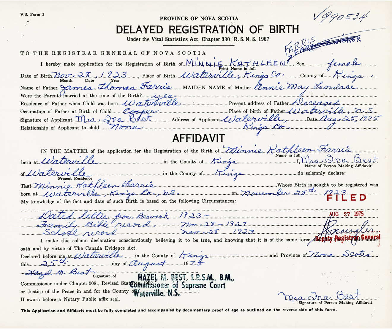 That Minnie KathleenFarris Whose Birth is sought to be registered was