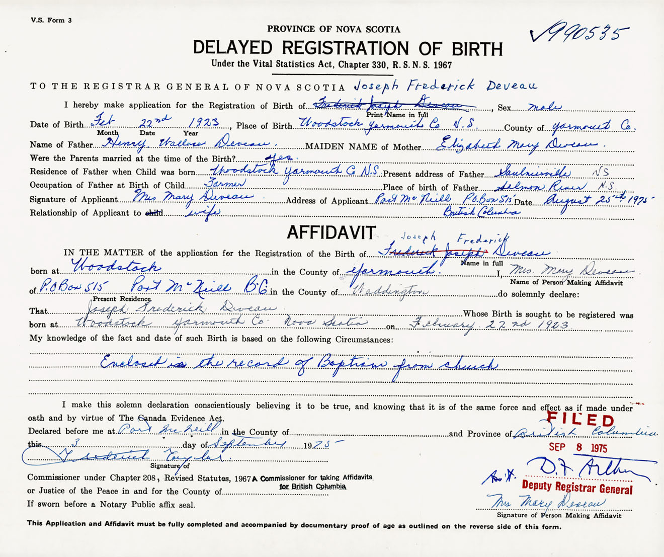 Signature of Applicant Mrs. Mary Deveau Address of Applicant Port McNeill, British Columbia Date August 25, 1975