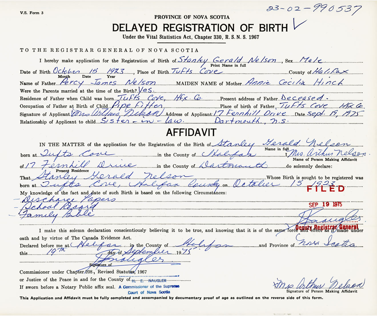 I hereby make application for the Registration of Birth of Stanley GeraldNelson Sex Male