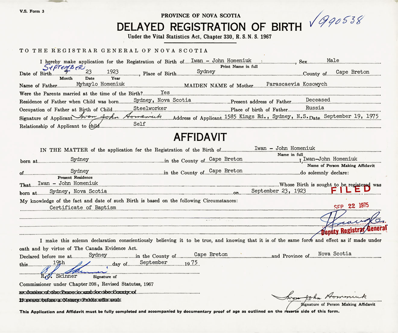 IN THE MATTER of the application for the Registration of the Birth of Iwan JohnHomeniuk