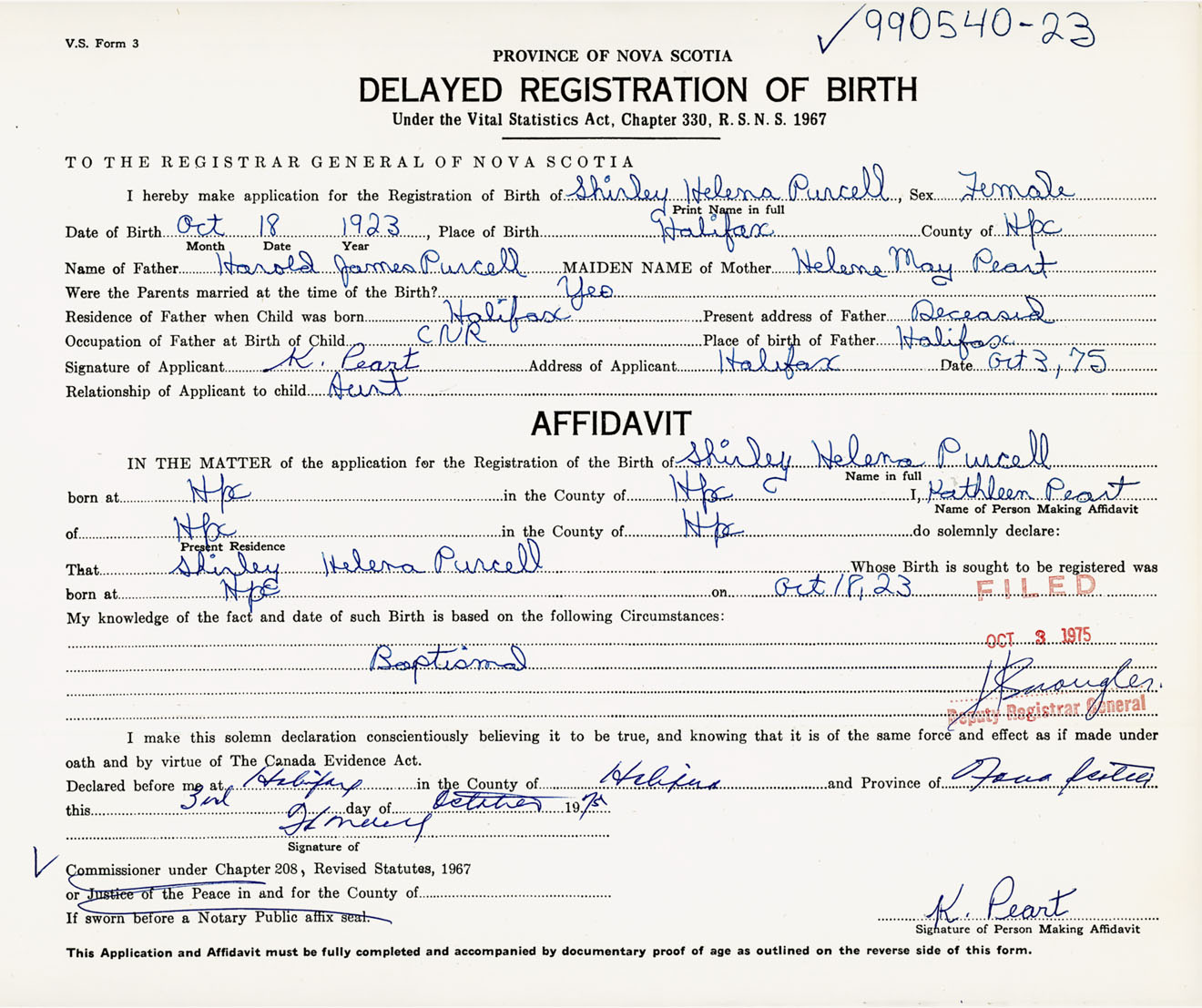 I hereby make application for the Registration of Birth of Shirley HelenaPurcell Sex Female