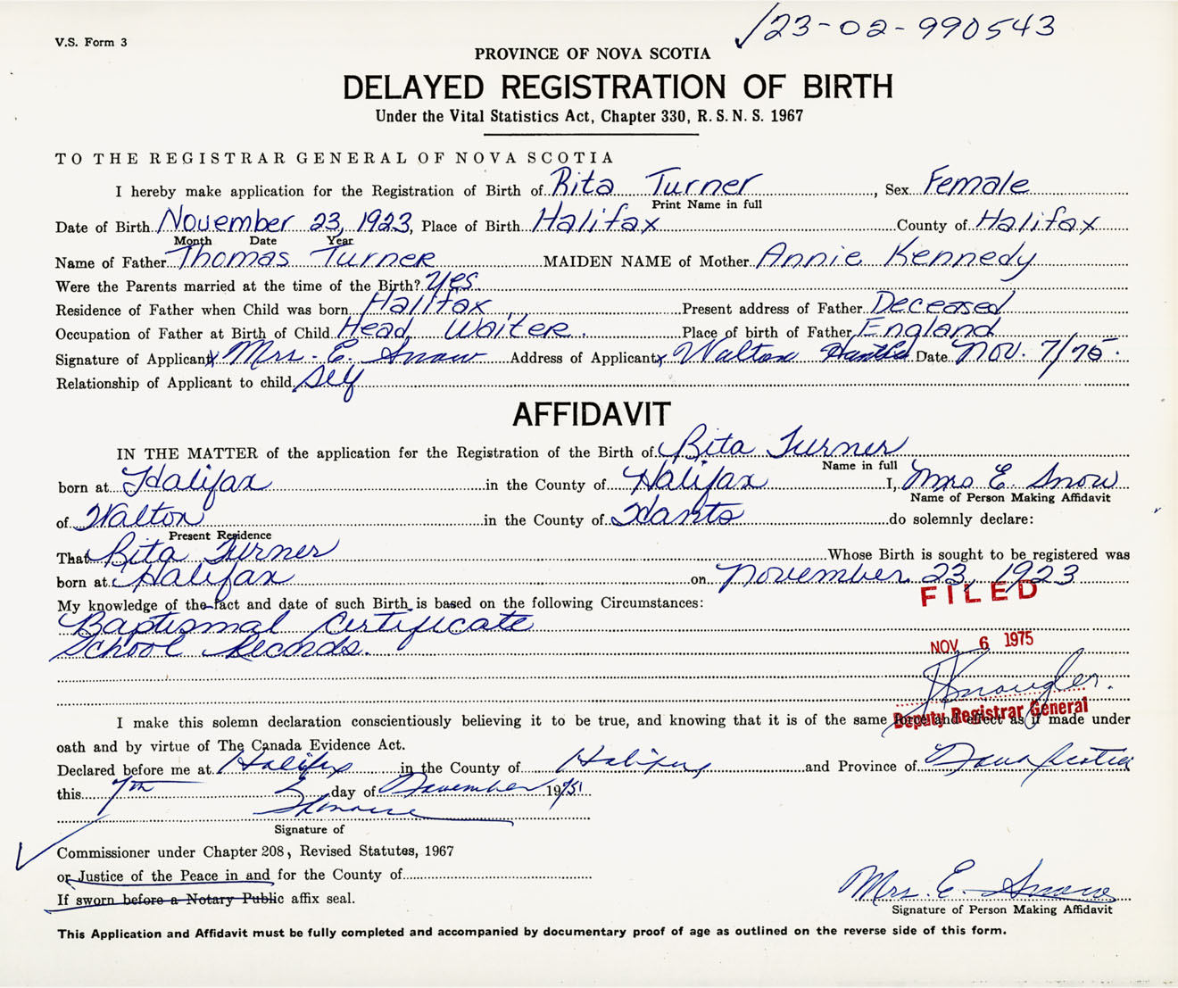 I hereby make application for the Registration of Birth of RitaTurner Sex Female