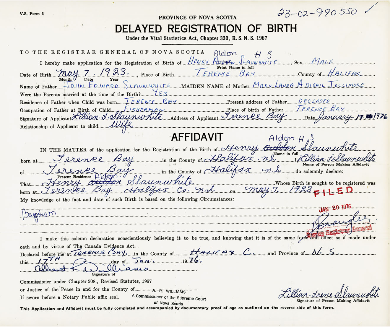 Signature of Applicant Lillian I. Slaunwhite Address of Applicant Terence Bay, Halifax Co., NS Date 17 January 1976