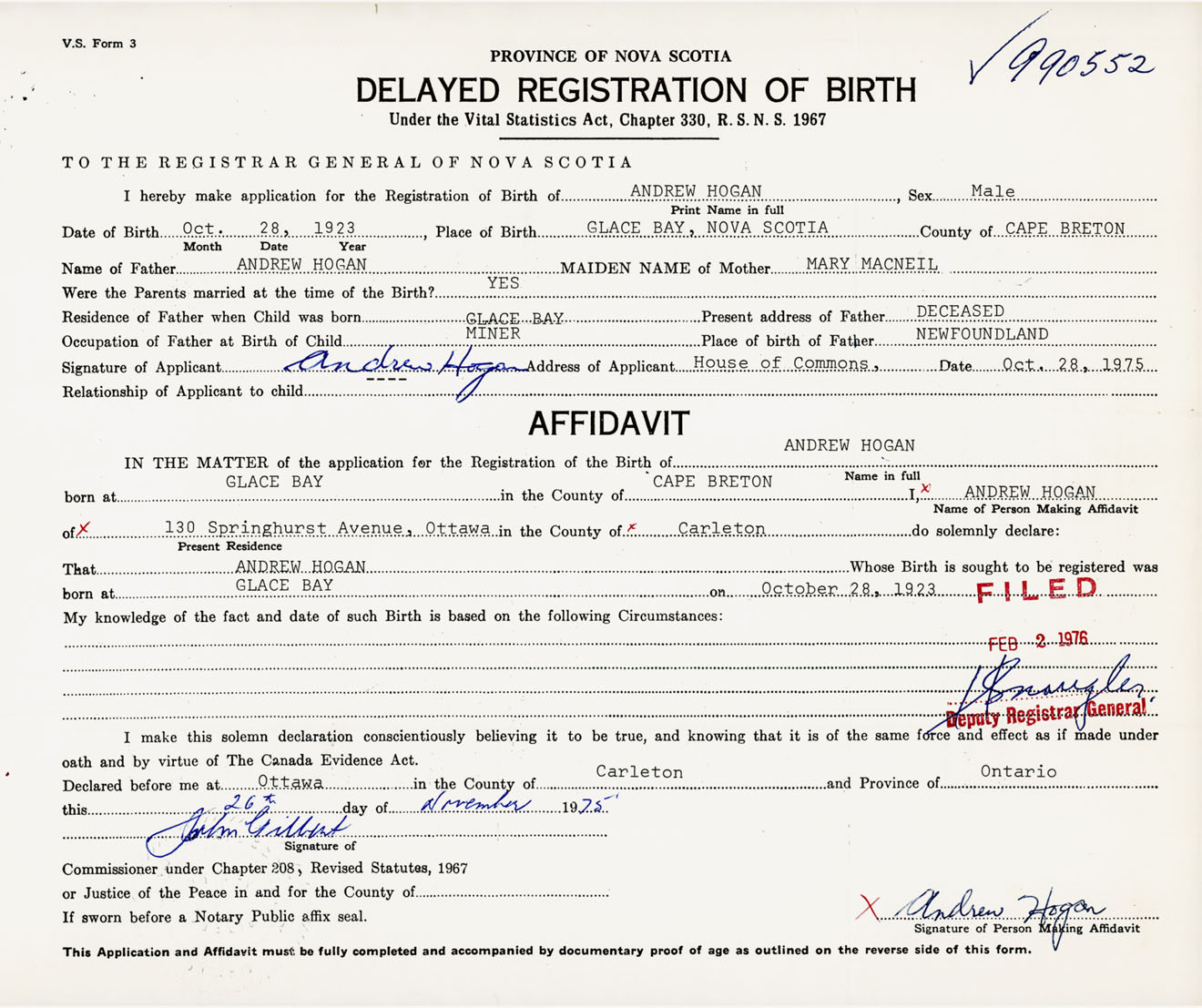 Signature of Applicant Andrew Hogan Address of Applicant House of Commons, Ottawa, Ontario Date 28 October 1975