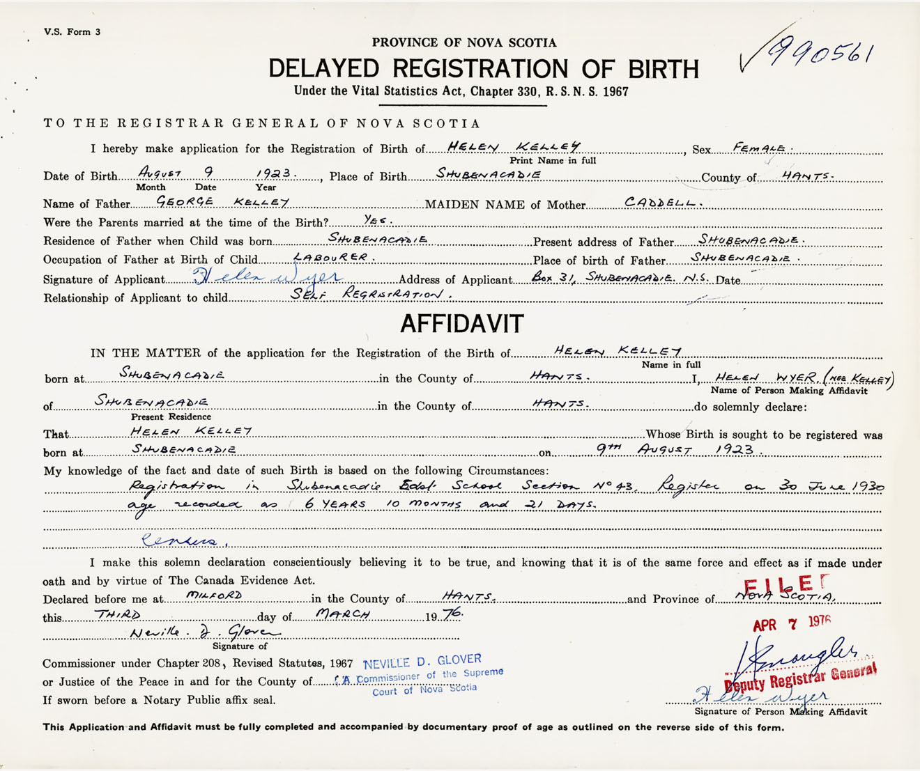 Signature of Applicant Helen Wyer Address of Applicant Box 31, Shubenacadie, Hants Co., NS Date