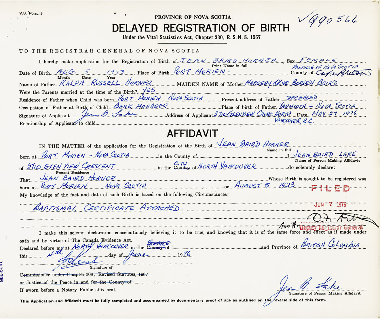I hereby make application for the Registration of Birth of Jean BairdHorner Sex Female