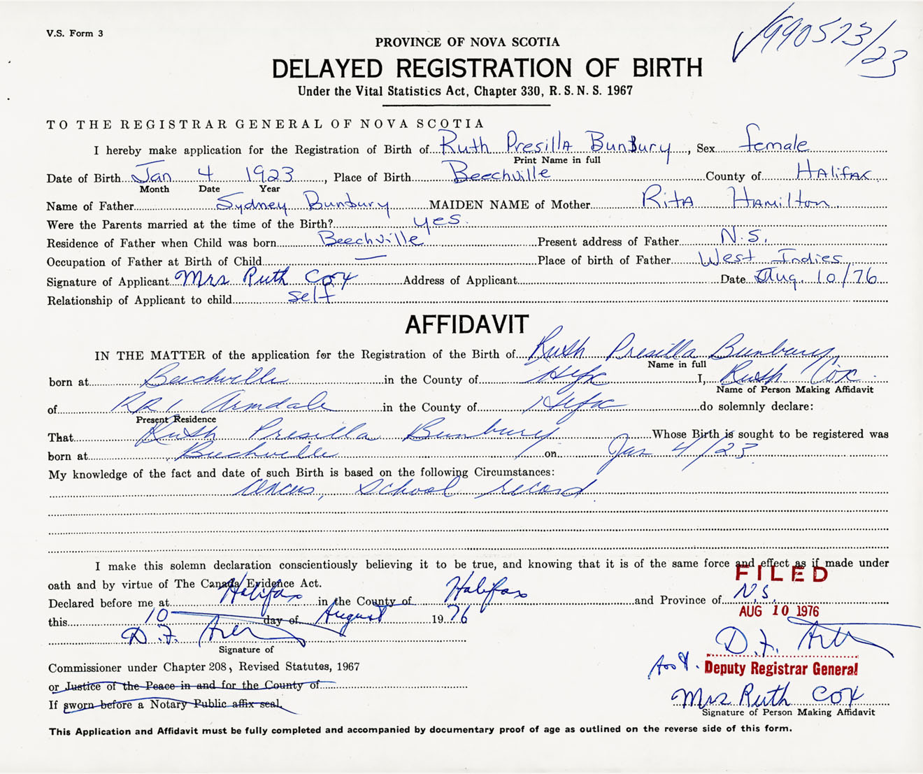 Signature of Applicant Mrs. Ruth Cox Address of Applicant RR #1, Beechville, Halifax Co., NS Date 10 August 1976
