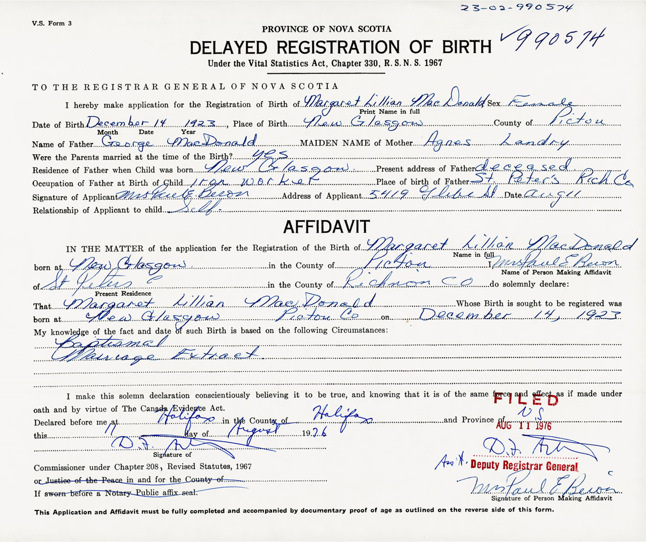 IN THE MATTER of the application for the Registration of the Birth of Margaret LillianMacdonald