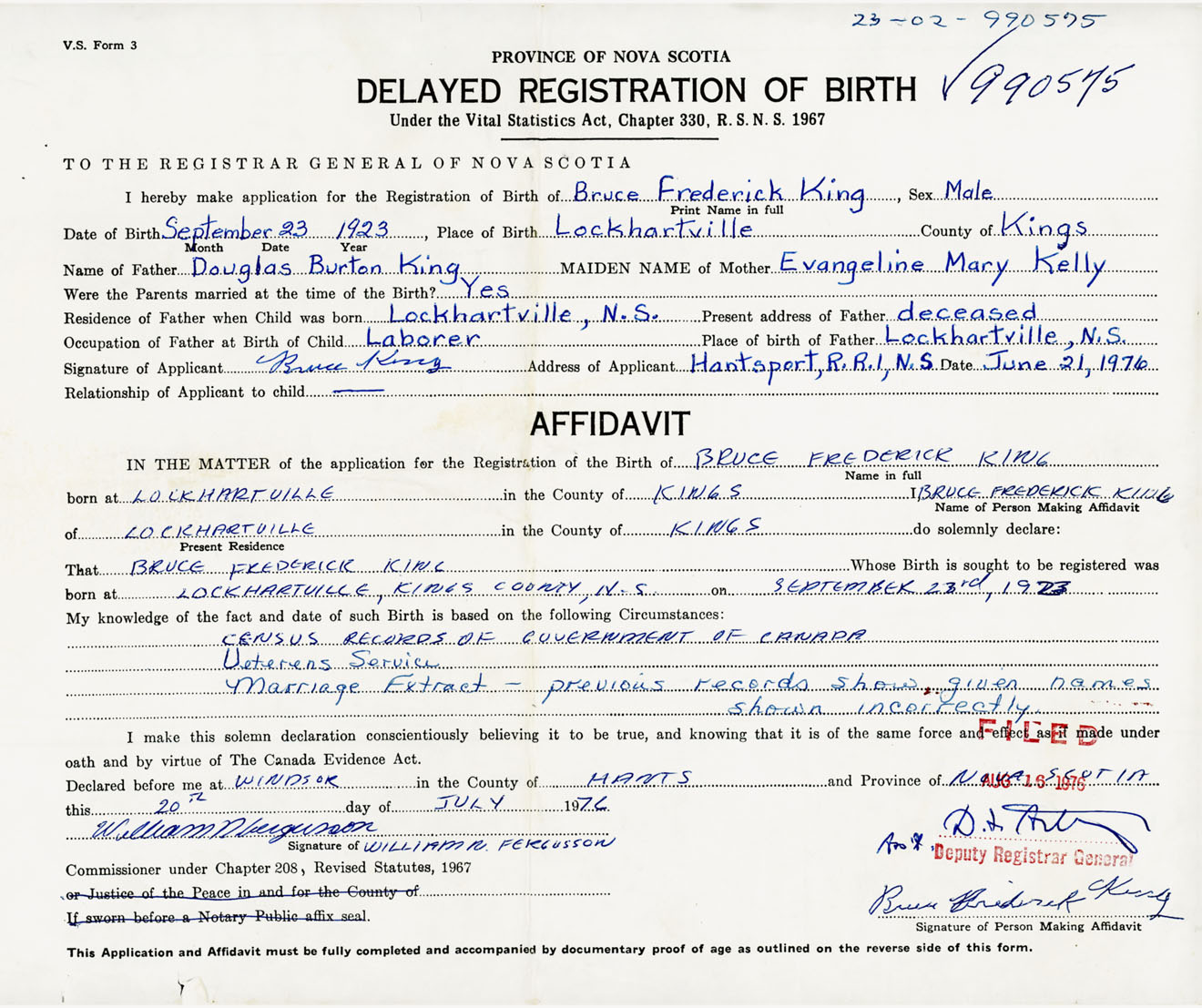 Signature of Applicant Bruce King Address of Applicant RR #1, Hantsport, Kings Co., NS Date 21 June 1976