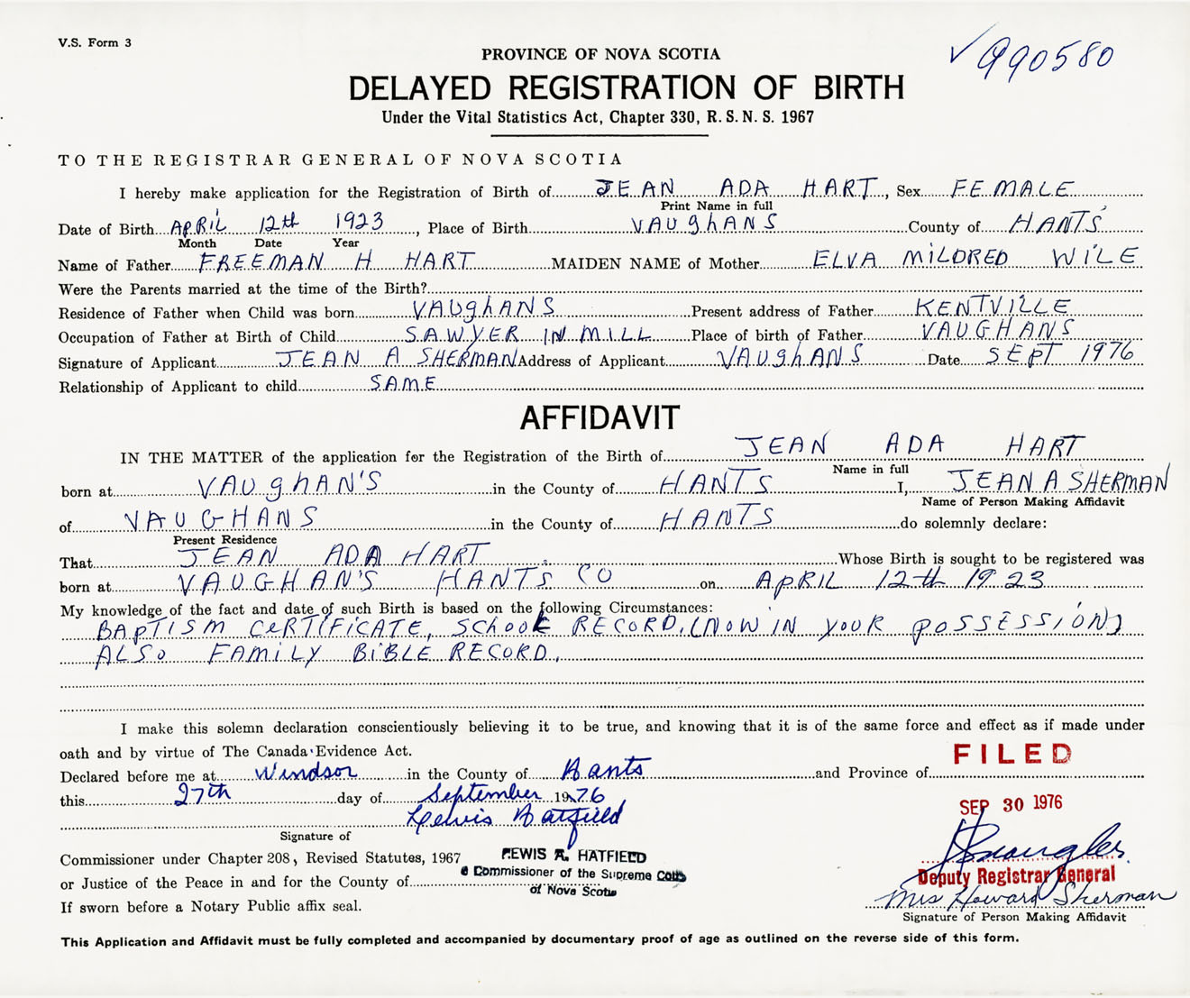 Signature of Applicant Jean A. Sherman Address of Applicant Vaughan, Hants Co., NS Date September 1976