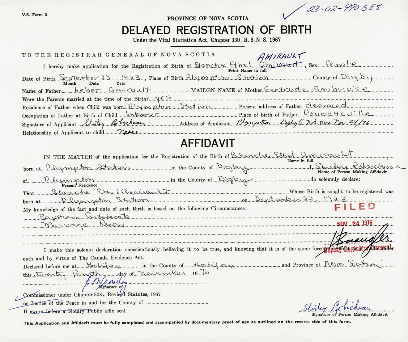 Signature of Applicant Shirley Robicheau Address of Applicant Plympton Station, Digby Co., NS Date 24 November 1976