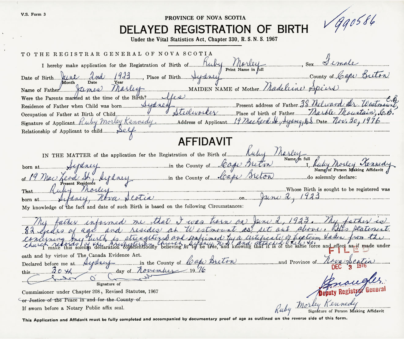 Signature of Applicant Ruby Morley Kennedy Address of Applicant 19 MacLeod Street, Sydney, Cape Breton Co., NS Date 30 November 1976