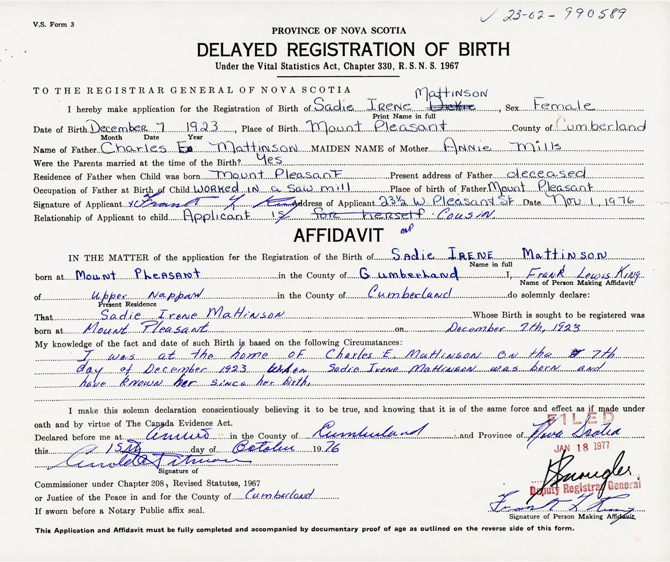 Signature of Applicant Frank L. King Address of Applicant 23 1/2 Pleasant Street, Upper Nappan, Cumberland Co., NS Date 1 November 1976