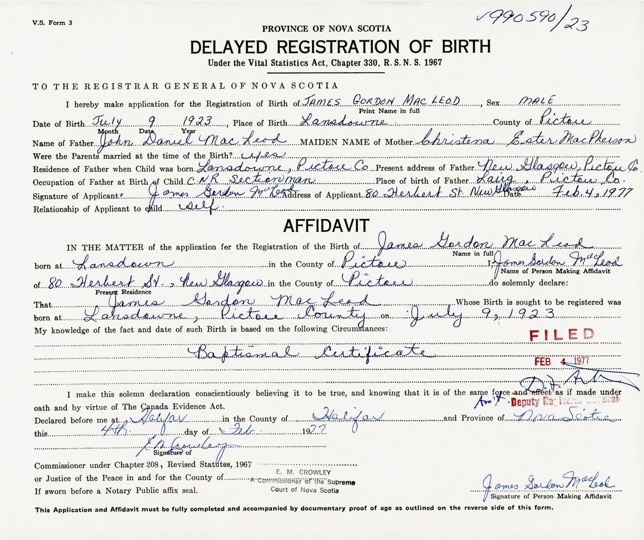 Signature of Applicant James Gordon MacLeod Address of Applicant 80 Herbert Street, New Glasgow, Pictou Co., NS Date 4 February 1977