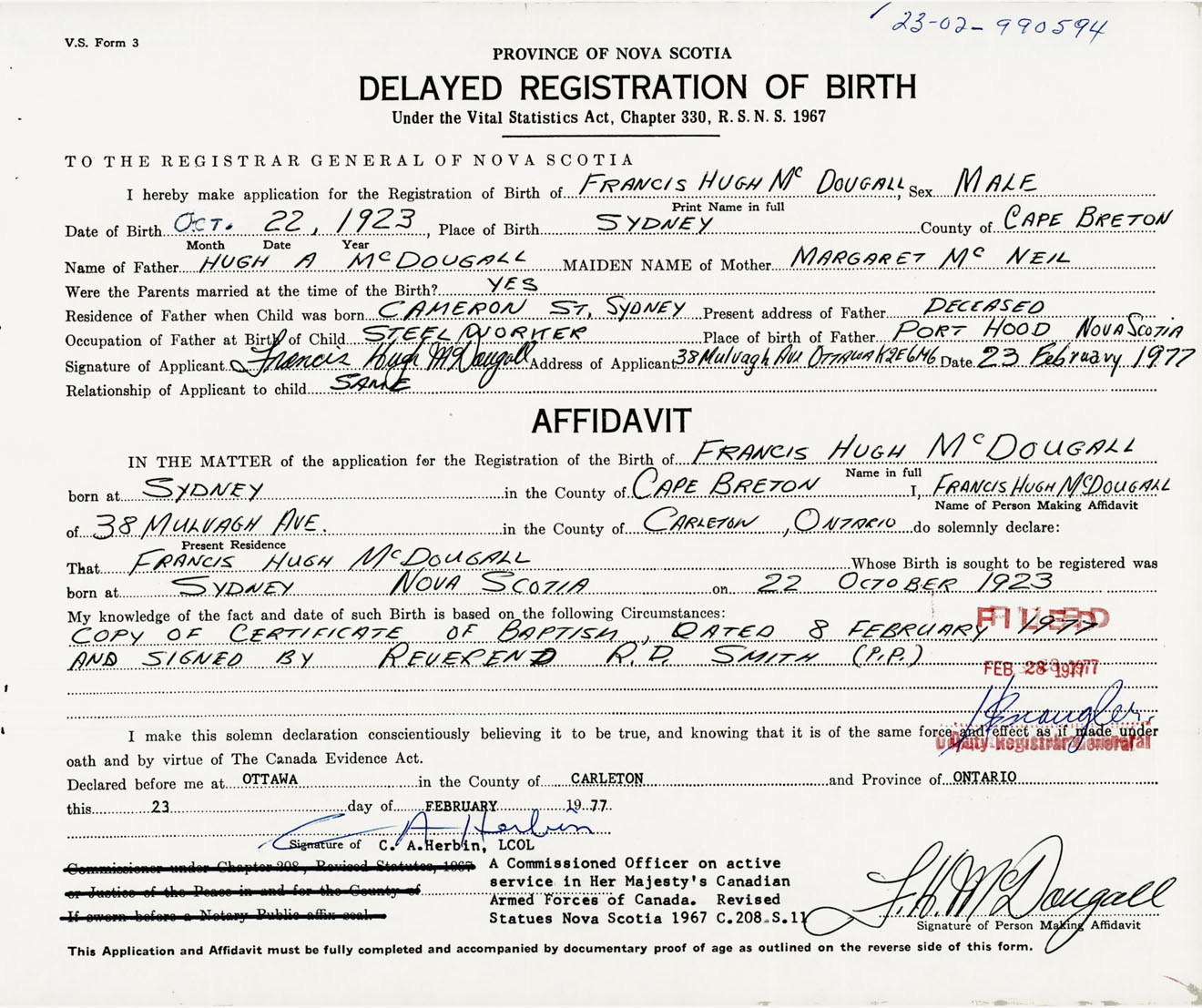 Date of Birth October 22, 1923 Place of Birth SydneyCounty of Cape Breton