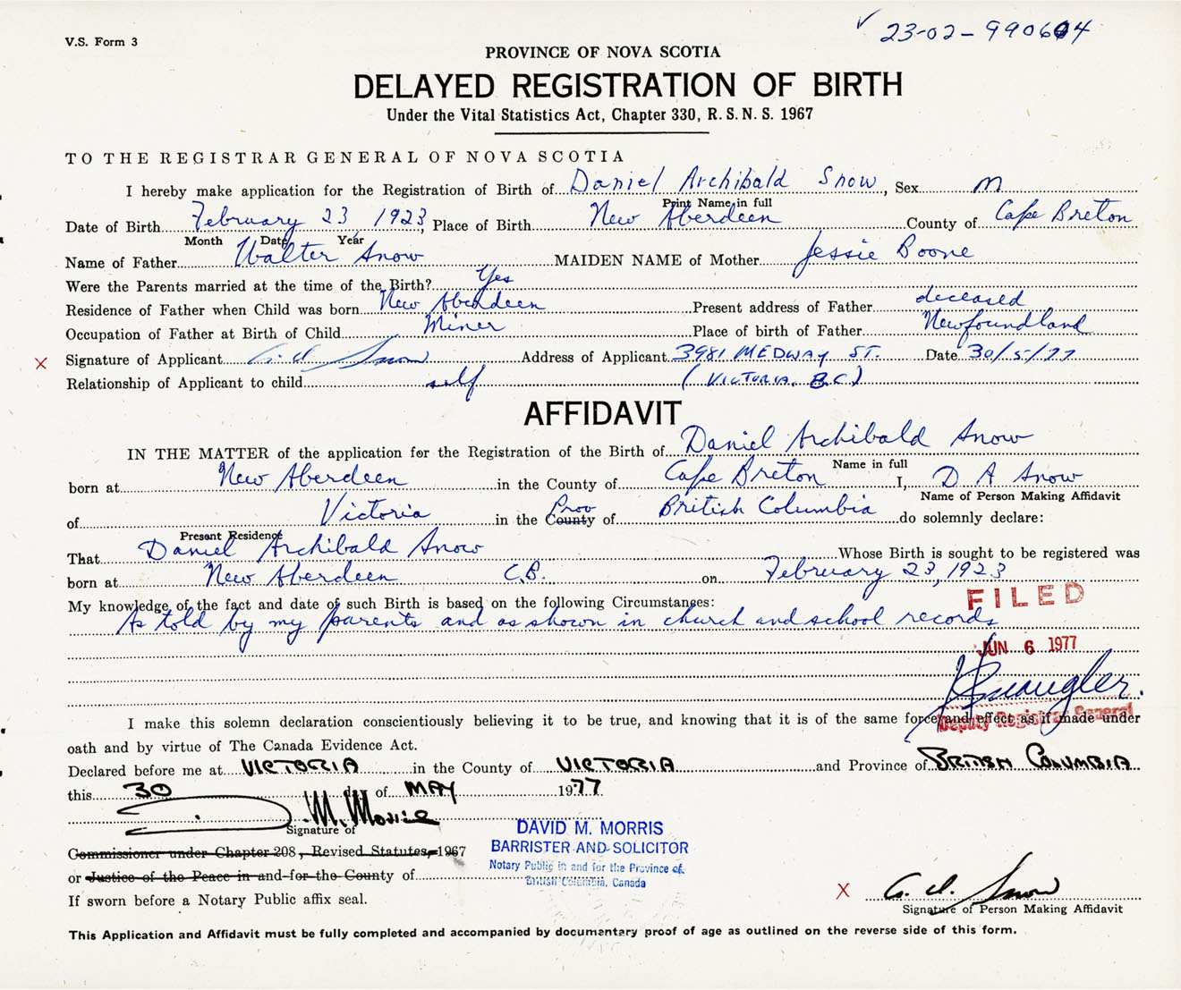 IN THE MATTER of the application for the Registration of the Birth of Daniel ArchibaldSnow