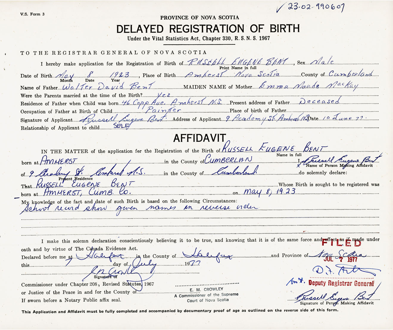Signature of Applicant Russell Eugene Bent Address of Applicant 9 Academy Street, Amherst, Cumberland Co., NS Date 10 June 1977