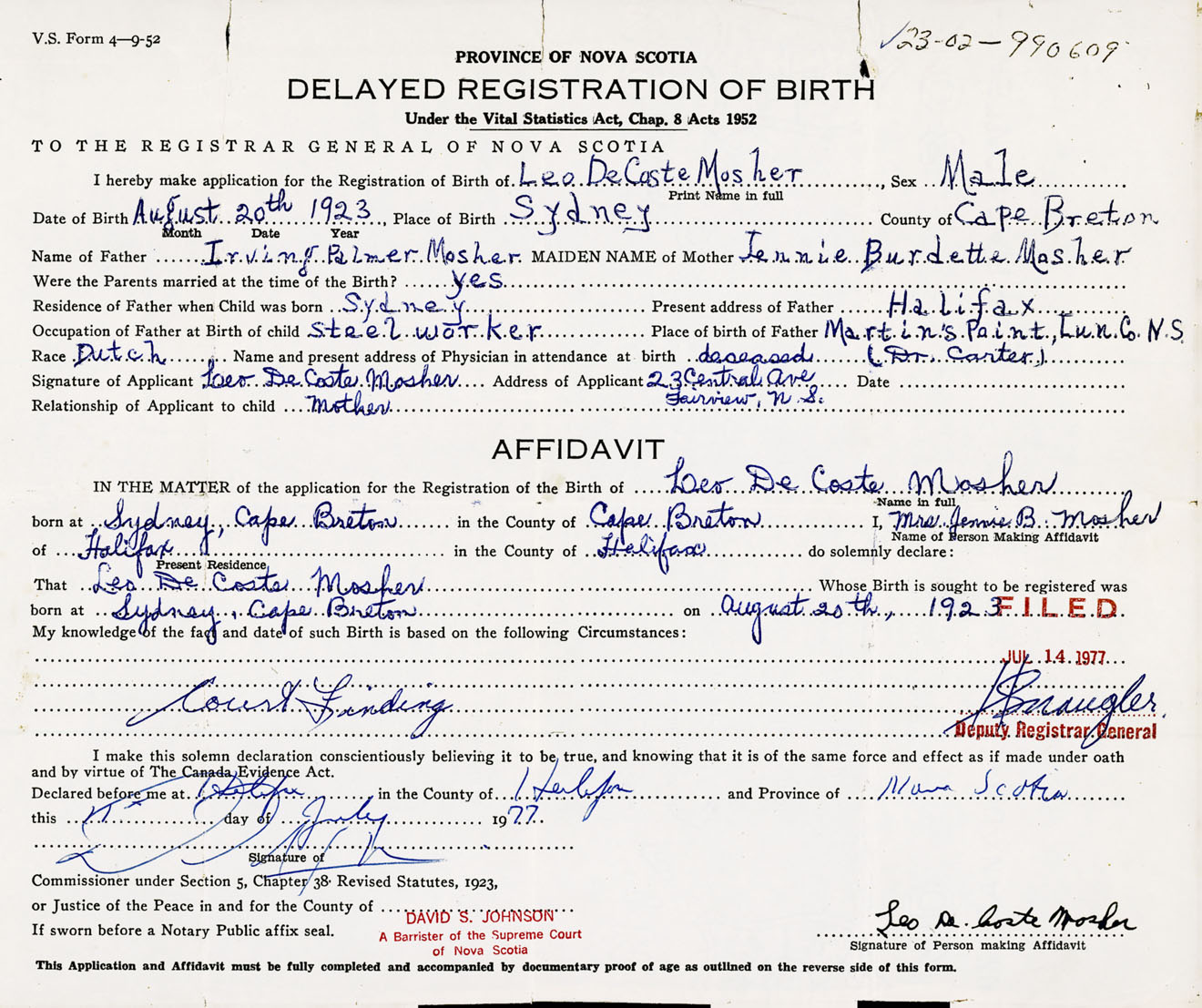 Signature of Applicant Leo Decoste Mosher Address of Applicant 23 Central Avenue, Fairview, Halifax Co., NS Date July 1977