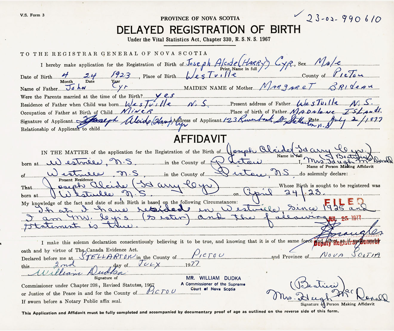 Signature of Applicant Joseph Alcide Harry Cyr Address of Applicant 123 Riverbank Street, Stellarton, Pictou Co., NS Date 2 July 1977