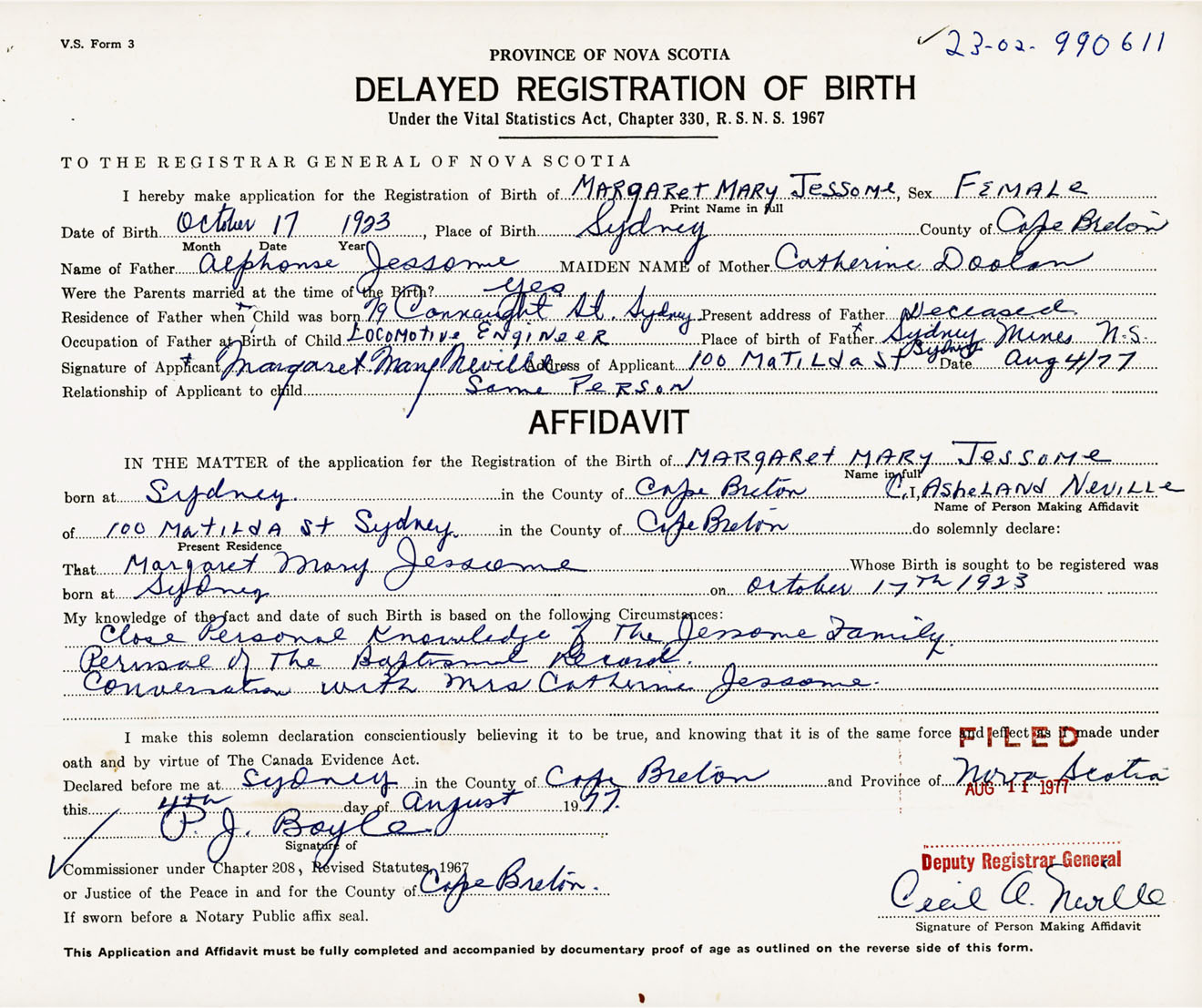 Signature of Applicant Margaret Mary Neville Address of Applicant 100 Matilda Street, Sydney Mines, Cape Breton Co., NS Date 4 August 1977