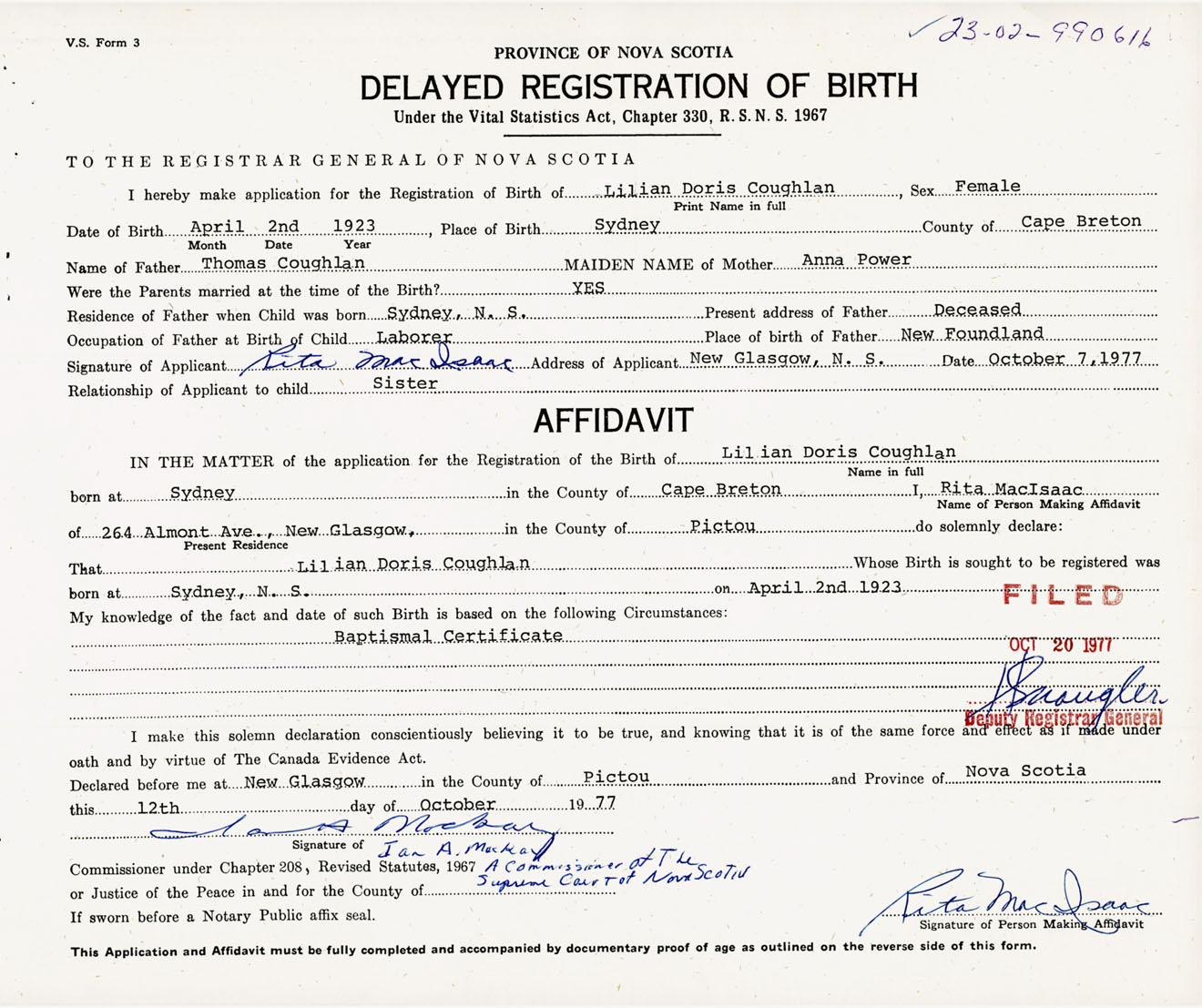 IN THE MATTER of the application for the Registration of the Birth of Lilian DorisCoughlan