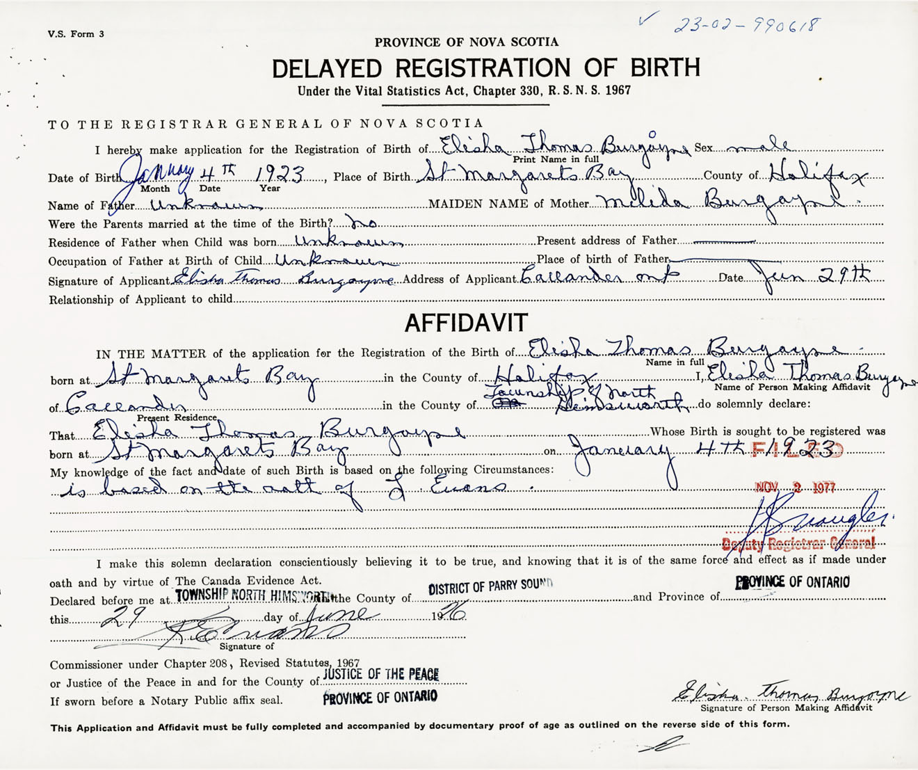 Signature of Applicant Elisha Thomas Burgoyne Address of Applicant Callander, Ontario Date 29 June 1976