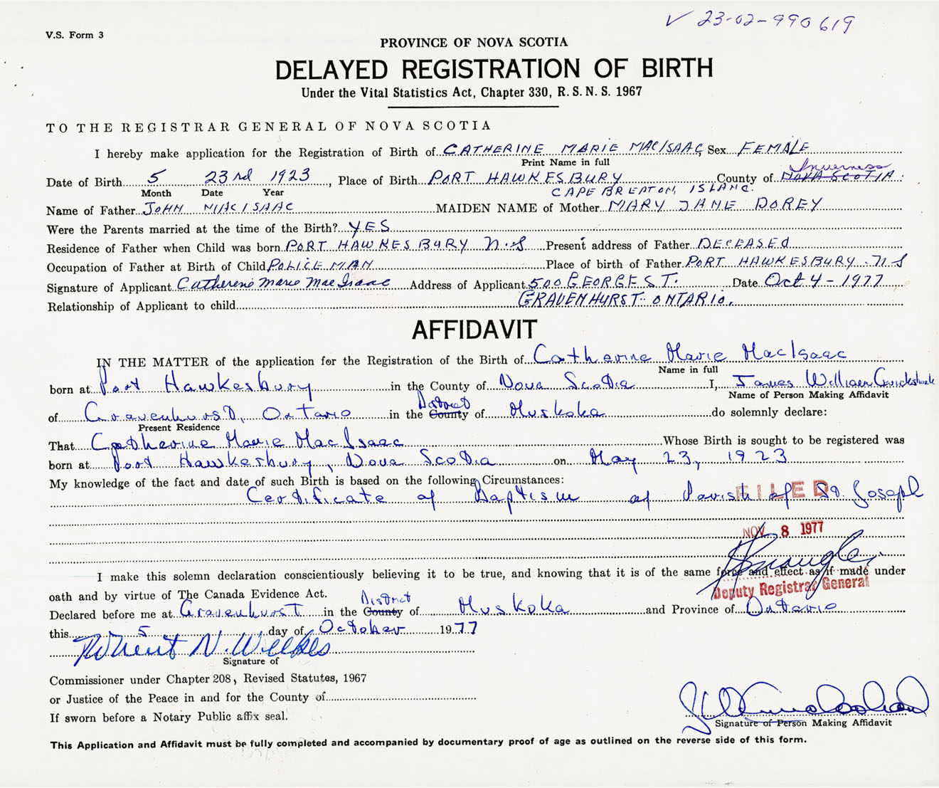 I hereby make application for the Registration of Birth of Catherine MarieMacIsaac Sex Female