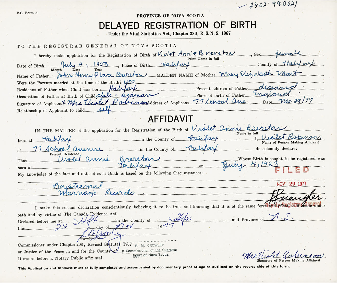 Signature of Applicant Mrs. Violet Robinson Address of Applicant 77 School Avenue, Halifax, NS Date 29 November 1977