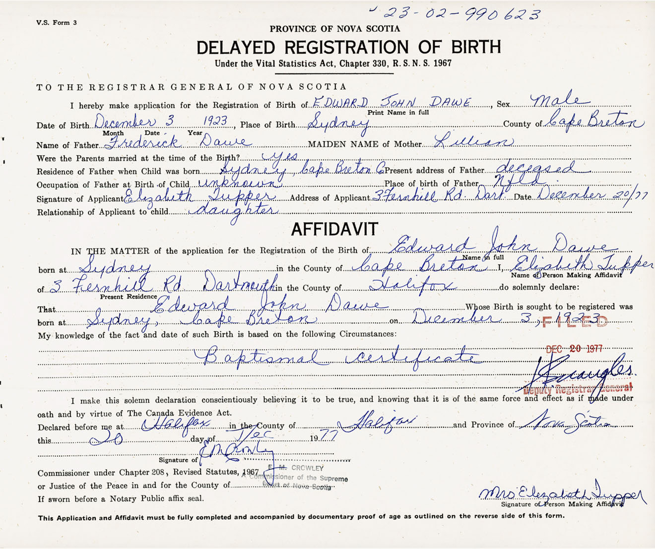 I hereby make application for the Registration of Birth of Edward JohnDawe Sex Male