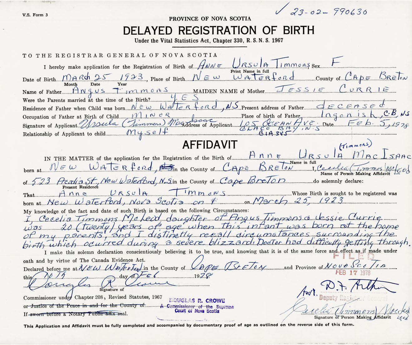 Signature of Applicant Ursula Timmons MacIsaac Address of Applicant 105 Ocean Avenue, Glace Bay, Cape Breton Co., NS, B1A 3V5 Date 5 February 1978
