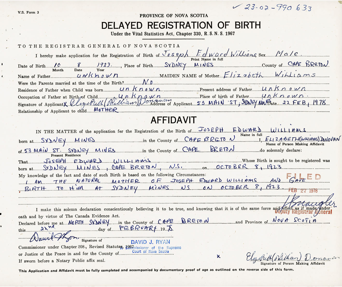 I am the natural mother of Joseph Edward Williams and gave birth to him at Sydney Mines, NS on October 8, 1923.