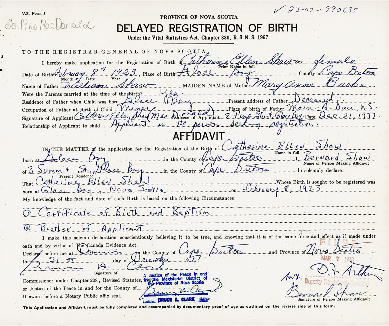 Signature of Applicant Catherine Ellen Shaw MacDonald Address of Applicant 8 Pine Street, Glace Bay, Cape Breton Co., NS Date 21 December 1977