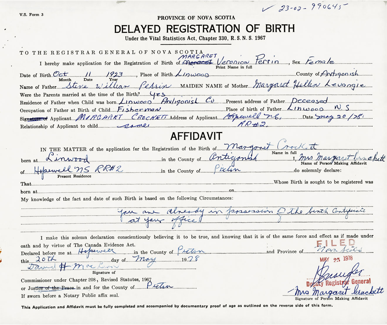 Signature of Applicant Margaret Crockett Address of Applicant RR #2, Hopewell, Pictou Co., NS Date 20 May 1978