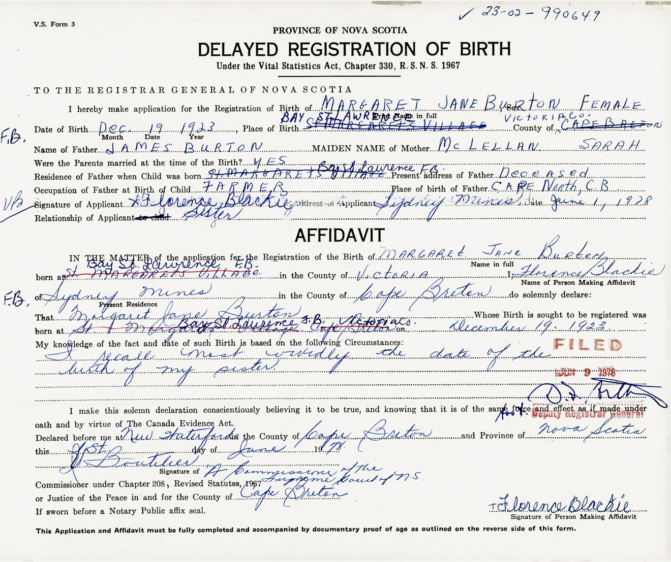 Signature of Applicant Florence Blackie Address of Applicant Sydney Mines, Cape Breton Co., NS Date 1 June 1978